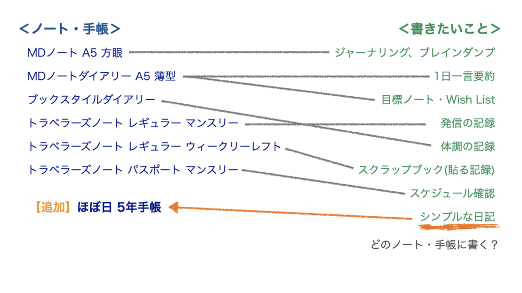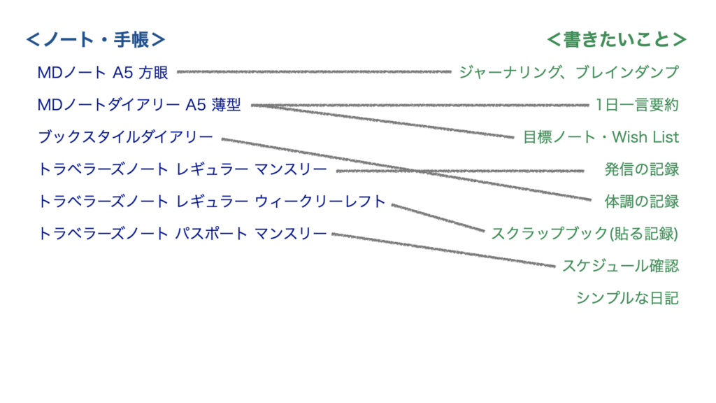 2つのリストを並べて、”どのノート・手帳に、どの内容を書くか”を考えて、線で結びます。