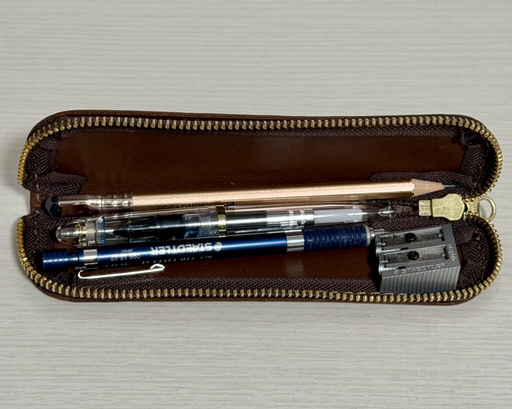 革製品は、どんどん自分に馴染んでいくので、ペンケースも中の筆記具もお気に入りになります。