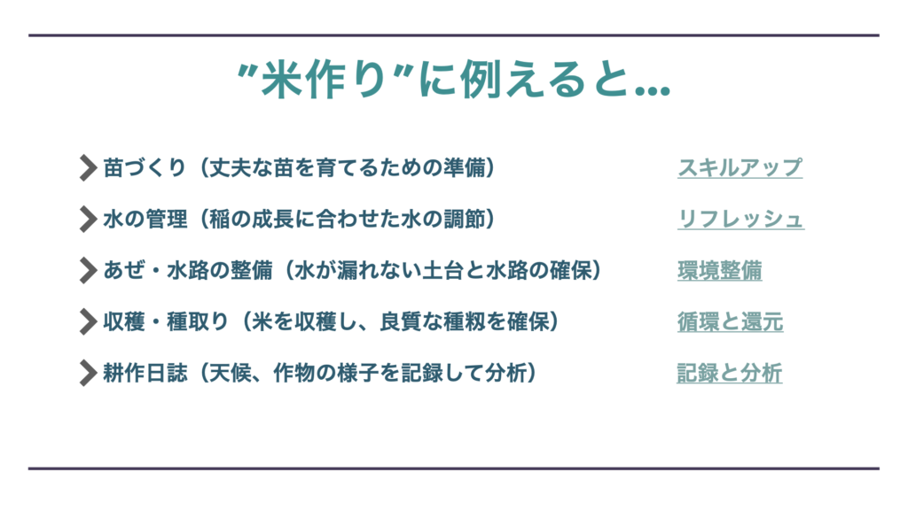 そんなときに、”米作り”のような様々な工程のあるものと掛け合わせて考えると、良いサイクルが考えやすいです。